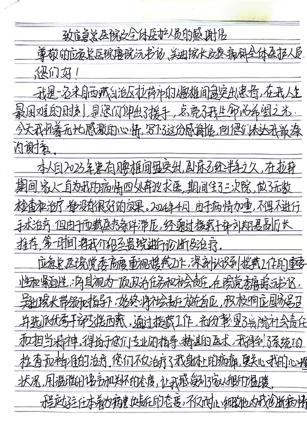 除了赠送锦旗,患者及家属还专门写了一封感谢信,字里行间表达了对应急总医院及疼痛科程庆好主任团队的感激之情。