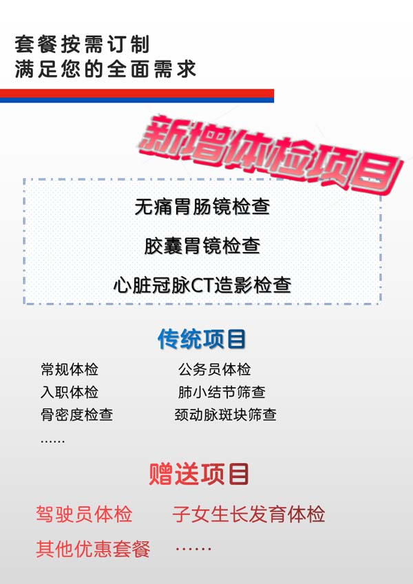 应急总医院体检中心为更好的服务于广大体检客户,根据客户需求,可以量身定制个性化体检项目,除磁控胶囊胃镜检查外,还依托医院新增了核磁检查、冠状动脉CT、无痛胃肠镜检查等高技术含量的体检项目。同时,体检阳性指标可由医院相关科室专家提供检后咨询。