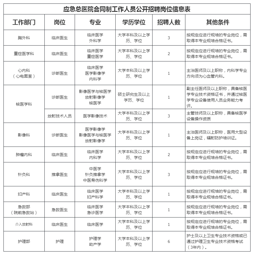 根据工作需要,应急总医院计划公开招聘合同制工作人员,现将有关事项公告如下:
